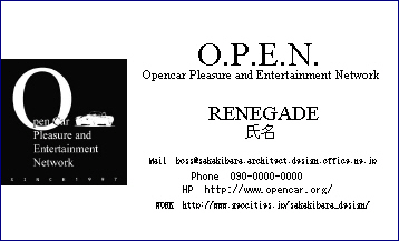 O.P.E.N.Cardとは、要するにO.P.E.N.の名刺です。 オフで知り合った人に自分の連絡先を教えたり、旅先で出会ったオー プンカー仲間とのコミュニケーションツールとしてお使い下さい。O.P.E.N.のオフィシャルHPが記載してありますので、帰ってからも掲示板等でその後のコミュニケーションも取れますね。 そこでここではO.P.E.N.Cardを皆さん独自で作ってもらえるように、その作り方を説明します。 1、まずここからフリーソフト(ラベル屋さん 9)をダウンロードしてください。 2、ソフトをDLしたらインストールします。 3、meishi_ver9.lcx をクリックして原稿ファイルをダウンロードします。旧バージョン(ラベル屋さんHOME)をお使いの方は opencard.lhd をダウンロードして下さい。 4、インストール完了後ソフトを立ち上げてファイルを読み込みます。 5、下のような雛形が表示されますので、ハンドル名、氏名、メールアドレス、電話番号、個人HPを持っている方はそのURL等を適時書き換えてください。 6、台紙は普通のミシン目入り(A4 10カット/枚)インクジェット用紙でOK。プリンターで印刷してハイ出来上がり。 O.P.E.N.Cardを使って、どんどんO.P.E.N.の輪を拡げましょう!