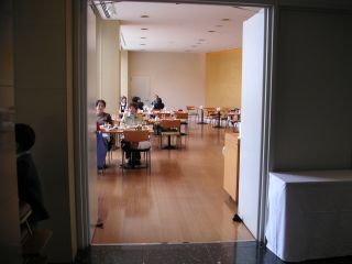 突き当たり左別室が会場です。案内にしたがってテーブルにお着きください。一般のお客様もいらっしゃる場合がありますのでご了承下さい。